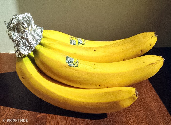 Lấy mảnh giấy bạc bọc phần cuống của quả chuối lại như hình vẽ, chuối sẽ tươi lâu hơn hẳn.