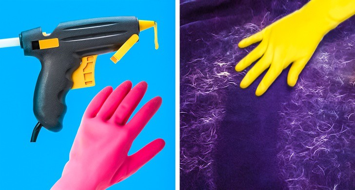 Tuy thú cưng rất đáng yêu nhưng không thể phủ nhận lông mèo lông chó vương khắp nơi sẽ gây ra không ít mệt mỏi trong việc dọn dẹp. Nếu ghế sô pha của bạn bị dính lông, hãy đeo găng tay, dùng súng phun keo nhỏ vài giọt trên găng rồi di chuyển bàn tay quanh ghế. Mọi sợi lông sẽ bị loại bỏ ngay tức khắc.